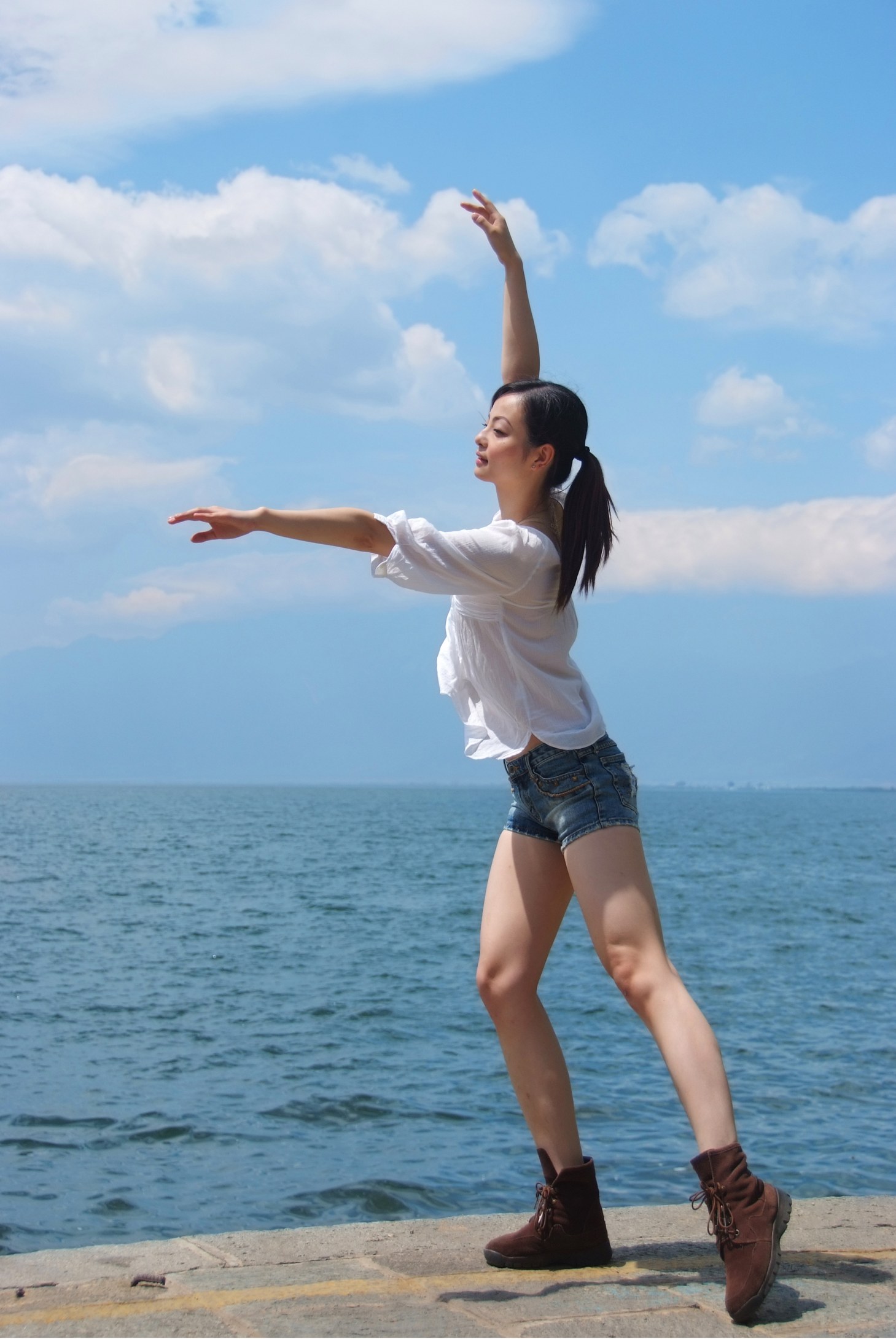 低机位拍摄人物照,容易让人显得更高,腿更长。塑造解放时期的英雄人物时,一般都采用低机位拍摄,以显示英雄的高大、威武、光辉的形象。运用低机位拍摄女性,可以塑造长腿美人的视觉感。