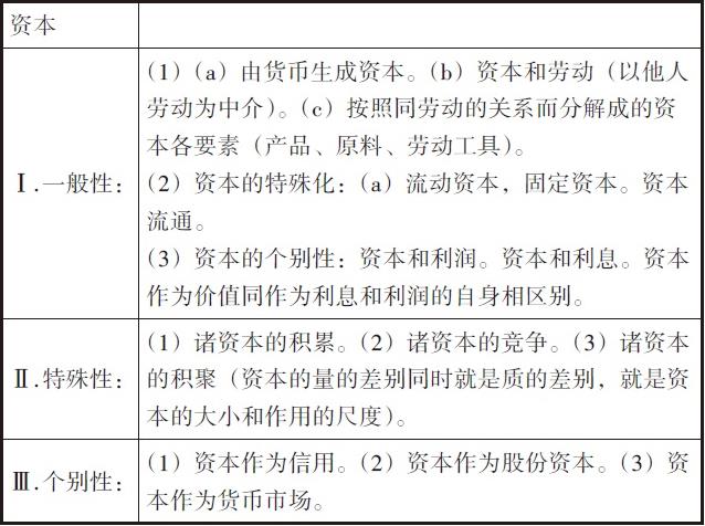 关于“资本一般”部分,马克思在写作过程中,其构想也曾发生过一定的变化。在《大纲》写作之初,马克思曾准备采取“一般性—特殊性—个别性”这样的三位一体计划(参见《〈大纲〉写作过程中关于资本的写作计划》表),不过这一计划并没有实施下去。后来,这里的“一般性”直接发展成“资本一般”。到《大纲》写作结束时,马克思给出的“资本一般”的具体规定已经不同于开始时的计划,而改为如下: