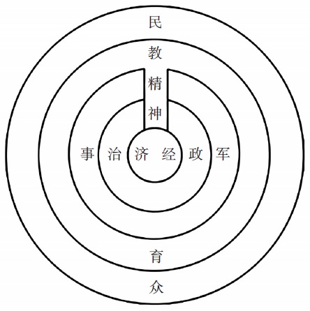 我以为人类社会一切的中心是“经济”。“经济”是包括物力、财力、土地等等的总称。但“经济”要以政治的力量去运用,要以政治的效力去发展。政治则要靠军事给予保证和培养。那长形的方框,就是精神。军事、政治、经济必须有精神贯通,而后才可相互为用,发生力量。至于教育,就是发动精神的起端。而发展教育,须赖民众。一个国家具备了这样条件,就会强而不衰。不错,国以民为本,但民众须受完善的教育,国家才有希望。今日日本如此兴盛,全系其“军国民教育”之成效;苏联给予德国反攻力量很大,就是因为苏联二个半五年计划收到相当效果。有位参政员莫德惠先生向我说过,苏联五年计划中的最大功绩就是教育的成功!莫先生在民国十七年至十九年前后在苏联三年,他曾任吾国政府所派往订约的特使,他那时看见苏联训练五百万儿童给予特殊的教育,全国采用一律的教科书,采取同样的教授法。现在击败德军的主力军,恐怕就是那些儿童长成的青年!因此我们认为强国的民众必须要受完善的教育,才能改造精神,担任军事、政治、经济的责任,建设强大的国家。兄弟对于此次世界大战中所得到的正面认识是如此。现在当然不敢把它看作定论,将来是否还须补充及修改,未可逆定,我想唯有待将来战事结局后再详写成书,以资参证。