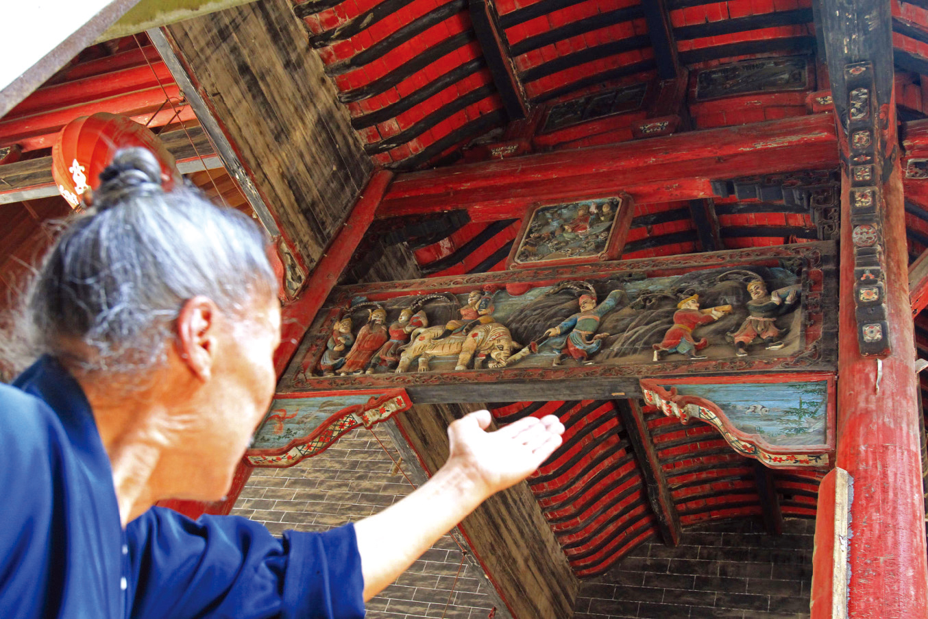 麻城五脑山帝主庙,余道士正在解说木雕图案(苏思 摄)