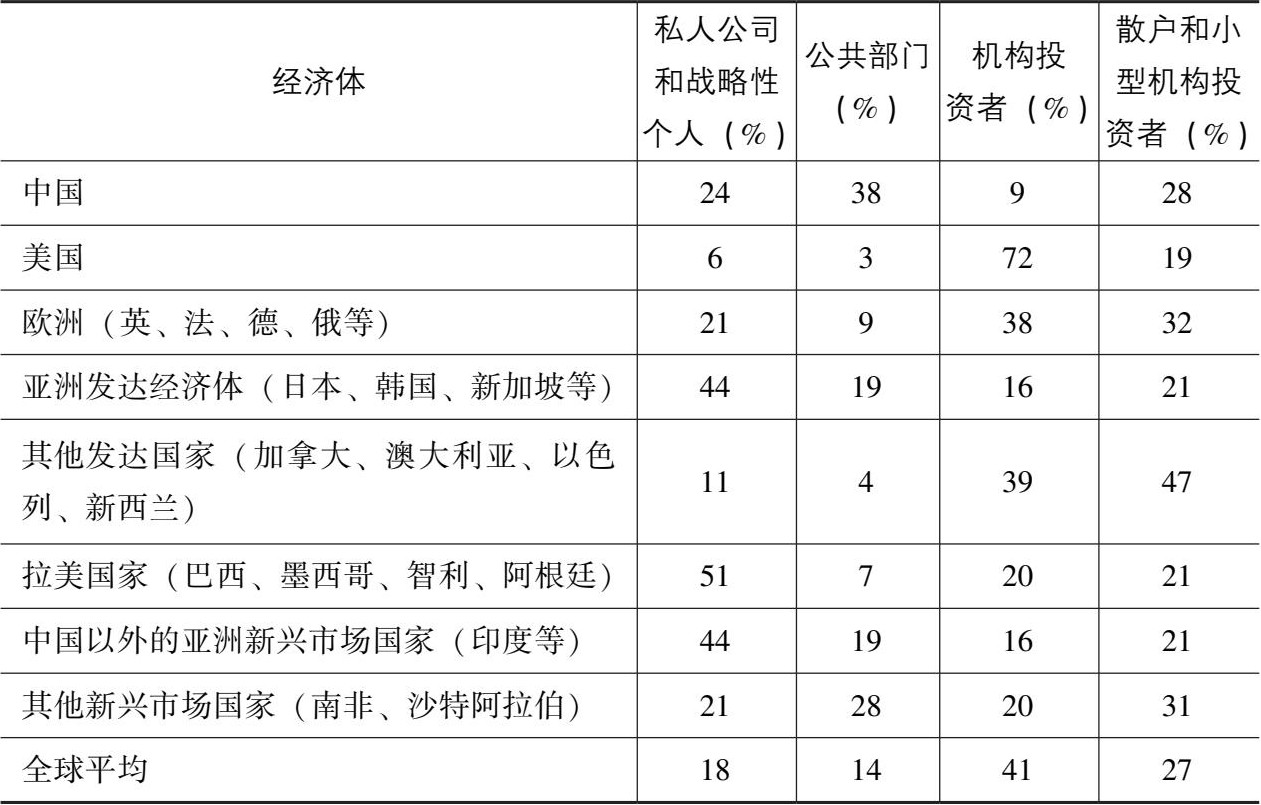 如果把视野进一步放宽,很容易看到,在全球范围内,私人储蓄通过金融中介被引入企业是市场经济中的普遍现象。虽然这些金融中介有一些像EPF、PNB和中国的国有商业银行一样由政府所有或控制,但多数是私营的机构投资者。前面表2.13的数据显示,在2017年底占全球市场市值90%的10 000家最大上市公司的股权价值中,有41%是由私营的机构投资者持有的,而与此相比,公共部门及“私人公司和战略性个人”仅持有14%和18%。