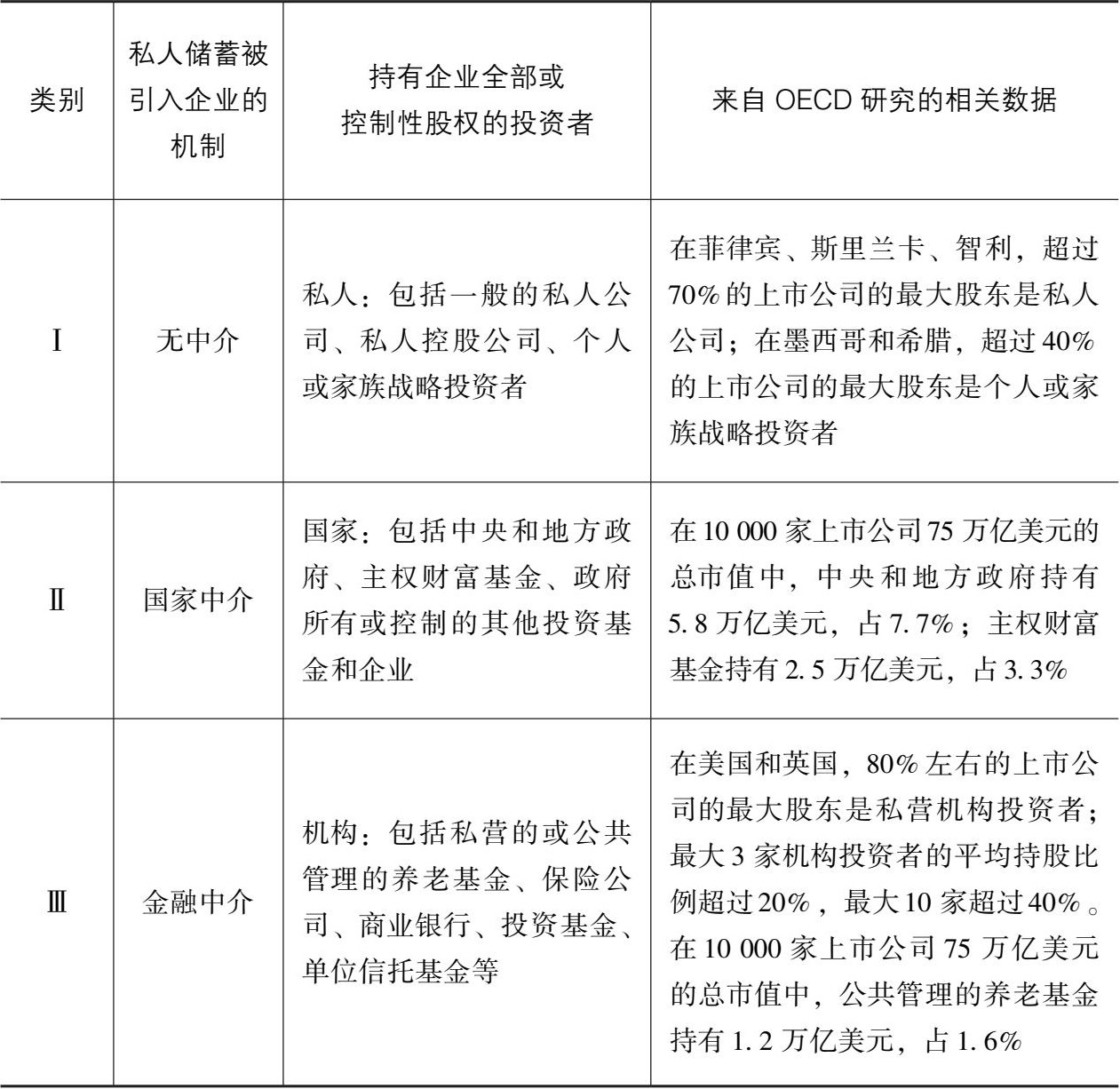 当然,如果进一步分析私营的机构投资者,现实情况也会极其复杂,因为各国机构投资者的法律框架和运作模式千差万别。但是,相当大一部分私人储蓄通过金融中介被投资于企业的股权和债权,是现代市场经济中的一个基本事实,这一点是确定无疑的。因此,概括而言,私人储蓄被引入企业,实际上存在以下三大类机制。