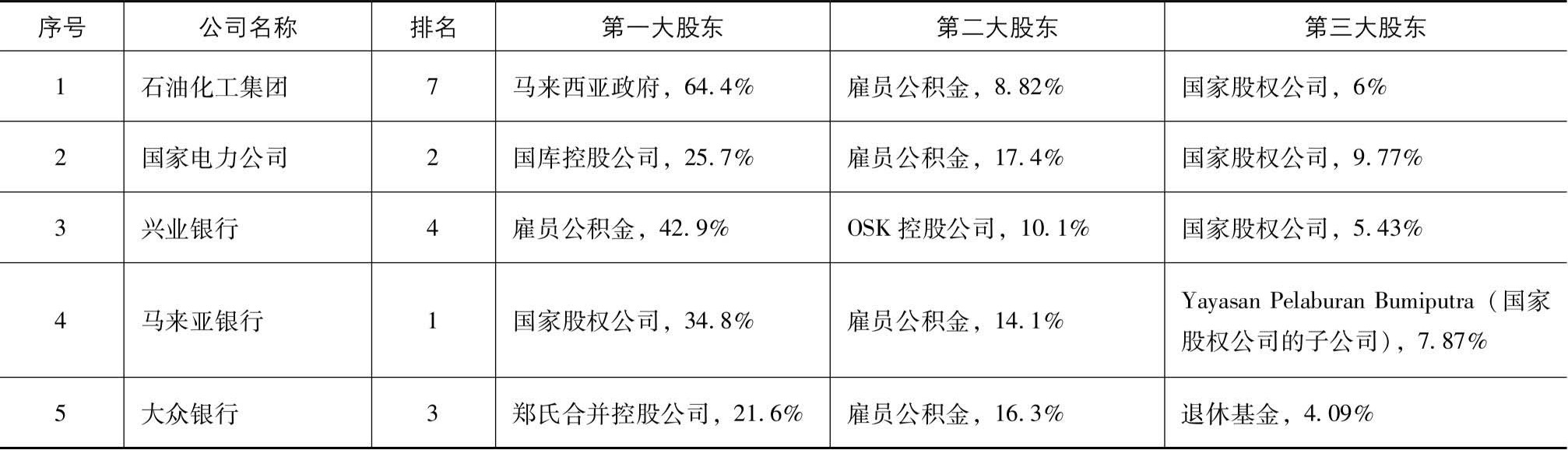 表2.14 马来西亚5家大公司的前三大股东