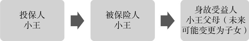 方案一:即将结婚的小王作为投保人和被保险人,小王的父母作为保单的身故受益人。小王婚前交纳全部保费,购买大额保单。待将来小王有了自己的后代,可以将保单的身故受益人变更为自己的子女。如图1.4所示。