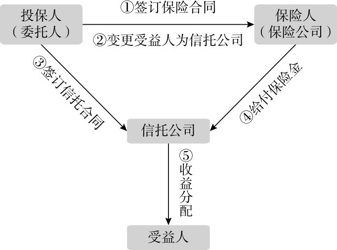 1.0版本的保险金信托是最早出现的模式,用一句话形容,可以是“前保险,后信托”。其操作方式是投保人购买保单之后,将保单的受益人变更为信托公司,如图2.1所示。