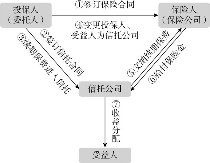 2.0版本的保险金信托被称为“内保险,外信托”,顾名思义,是将保单作为信托资产整体装入信托。其操作模式为,投保人在支付首期保费、保单生效之后,将保单的投保人和受益人均变更为信托公司,并且将未来应交纳的续期保费一并转入信托,由信托公司按照约定按时交纳续期保费,具体如图2.2所示。