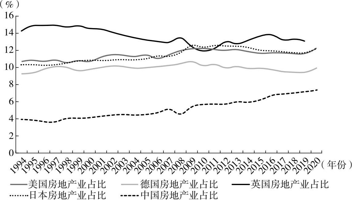 由于房地产业规模大、链条长、涉及面广,其在各国的宏观经济中都占有重要地位,属于支柱性产业。尽管统计口径有差异,在美国等经济体存量房占主体的市场中,房地产出租、代理和经纪以及建筑业中的住宅建筑投资的增加值合计也占到GDP(国内生产总值)的13%左右。五大经济体房地产业占GDP比重见图1.7。房地产业的稳定健康可持续发展,对我国经济至关重要。