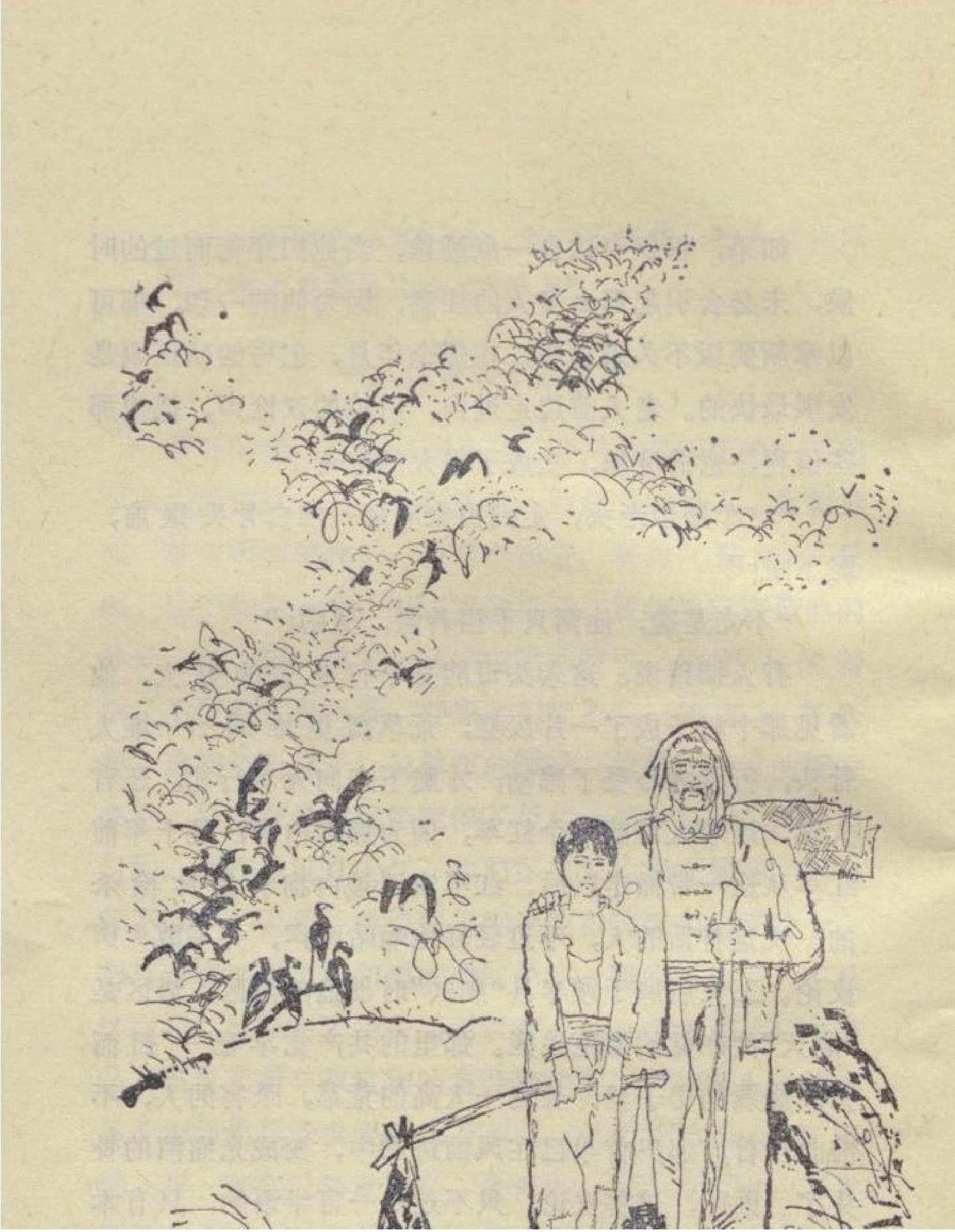 黄昏时候,王家店街头上,有两个要饭吃的,引起了人们的注意。这位苍白头发一脸胡子的老人,背着捆成一卷的棉裤和棉袄,还有个布袋,里边只装了一只碗。他手拉着一个十五六岁的孩子,看年纪应该是他的孙子。这小孩,拿了一只空空的破篮子,被老人牵着手,不住地东瞅西看,好象对街面上的一切都很有兴趣。这两个叫化子,虽然穿的破烂,肮脏,从背的棉衣来看,显然在外边已经流浪了很久,至少是一二月间出门的,现在是五月天气,他们穿出来的棉衣棉裤,早已穿不住了。但是,他们那黑糊糊地布满烟尘的脏脸上,却有着富裕的丰满和健康的红晕。一般的叫化子,不是这样的。他们除了蓬头垢面以外,脸上带着饥饿的菜色,眼里充满夺取食物的贪馋的欲望。这位老人牵着小孙子走路的样子也跟叫化子不同。叫化子都是溜着墙跟,在一家家门口盘桓来,盘桓去,拿不到食物,不肯轻易地走开。而这个老人,却走在街的中间,拉着孙子,匆匆地走去。他还低着头,好象并不急于发现肯给他饭吃的善男信女。