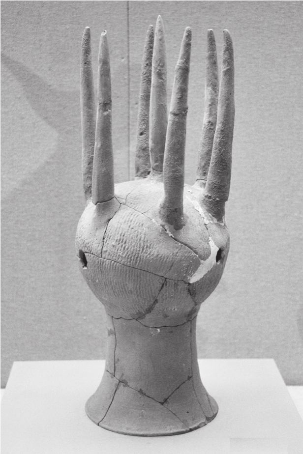 另一种是造型奇特的七足镂孔器,年代晚于鸟形神器,属于龙山时期遗存。共发现七件,它们的外观造型基本一致,“夹砂红陶,圆唇,长颈,球形腹,腹中部饰三个等距离镂孔,圜底部附加七个锥形长足,腹部饰竖向细绳纹”