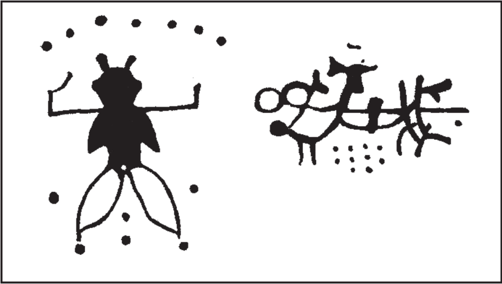 图2 山西柿子滩遗址中石器时代岩画示意图(左:作法女巫 右:狩猎格斗图或舞蹈图)
