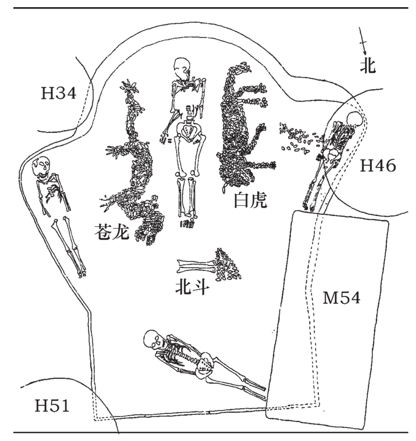 二十八星宿在上古时期被析解为“四陆”,又称“四宫”,指东宫苍龙、西宫白虎、南宫朱雀、北宫玄武。西水坡遗址M45中的蚌塑龙摆于墓主的东方,蚌塑虎摆于墓主的西方,正与苍龙、白虎的方位相对应,说明二十八星宿以东、西方星宿产生的年代最早。M45主人脚端的蚌塑三角形和人胫骨的组合图案,构成了一个明确可识的北斗星象图。其中,人胫骨是斗杓,正对着东侧的苍龙,蚌塑三角形图案是斗魁,枕于西方,恰好与西侧的白虎相对应。M45的蚌塑构图合乎中国古人的四陆观念,完全是当时天象的真实写照。
