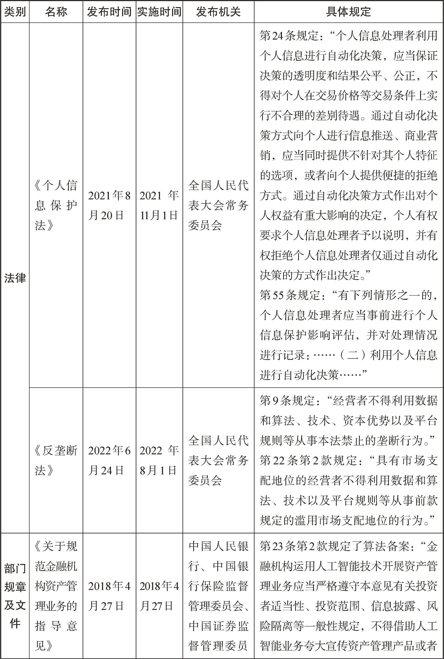 目前对于算法的监管主要是散见于各个法律、部门规章、规范性文件、地方规章和技术标准中,整理如下表:
