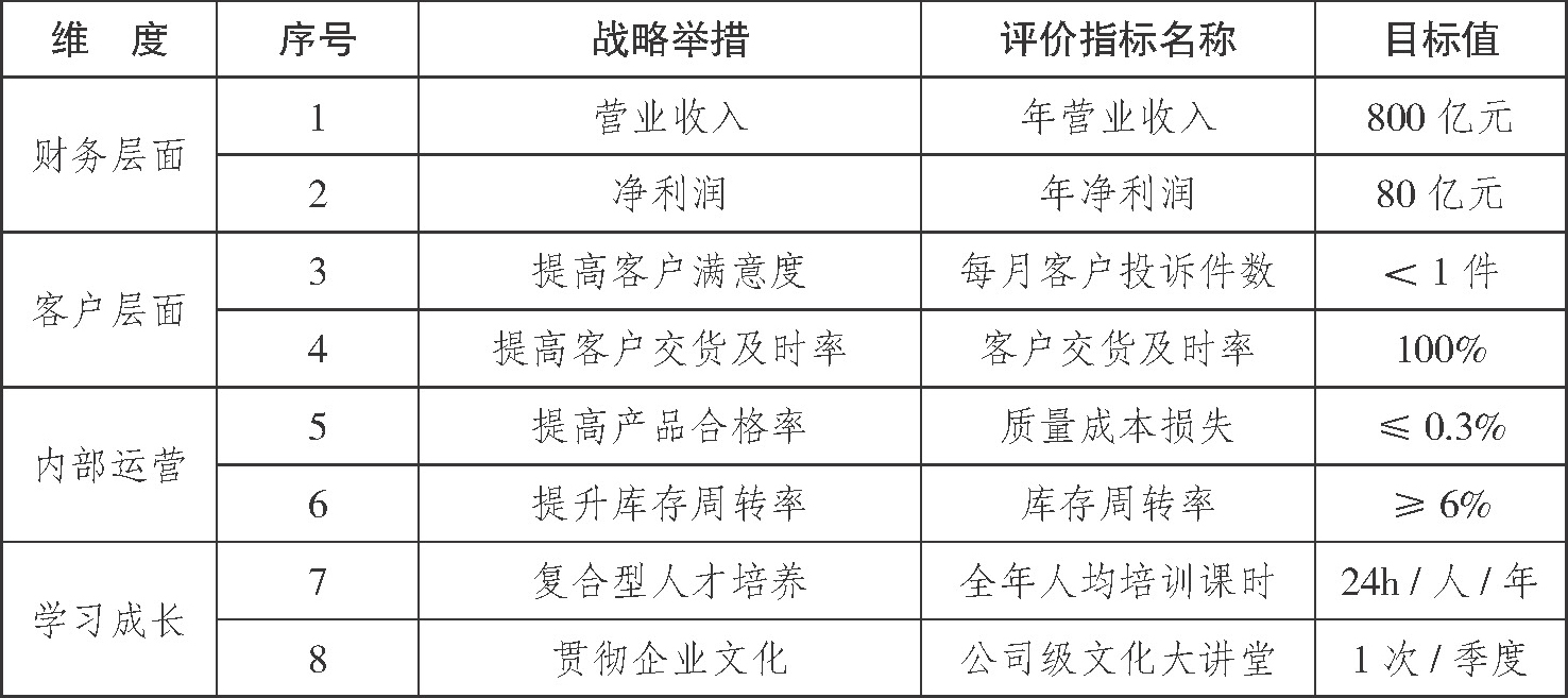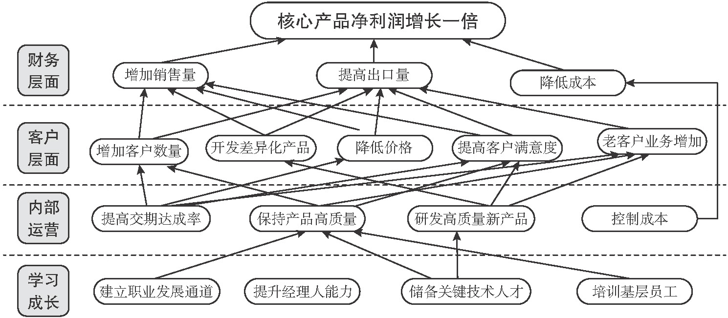 在明确战略目标与现状的差距后,我们就要进行关键举措的制定。完成这一步需要绘制公司的“战略地图”,而这一步中用到的工具则是“平衡计分卡”。平衡计分卡强调四项内容的平衡:财务指标和非财务指标的平衡;组织内外的平衡;超前指标和滞后指标的平衡;长期目标和短期目标的平衡。借助平衡计分卡,能够将战略地图中的举措分解成可衡量的目标,明确各个部门指标、目标值及行动方案。举例:就核心产品净利润增长一倍从财务层面、客户层面、内部运营、学习成长四个层面找措施。(关于平衡计分卡的建立与应用,后续章节专门详细阐述)