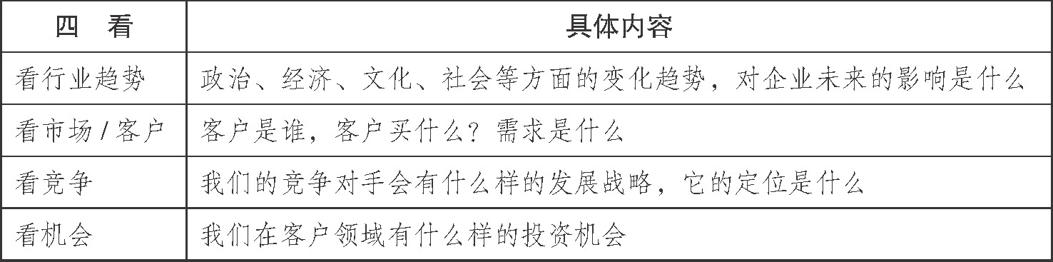 ,企业需要在变化中抓住机会,这使外部市场洞察越发重要。因此战略共识研讨会首先是向外看,通过对宏观环境、产业环境的分析,洞察市场目前大小、集中度格局与成长潜力,以此确定本公司是否要进入该行业,以及在进入行业后是否有利可图。其核心在于让中高管对外部环境进行分析、研讨,收集不同视角的意见,最终达成统一的认识。建议做好以下“四看”: