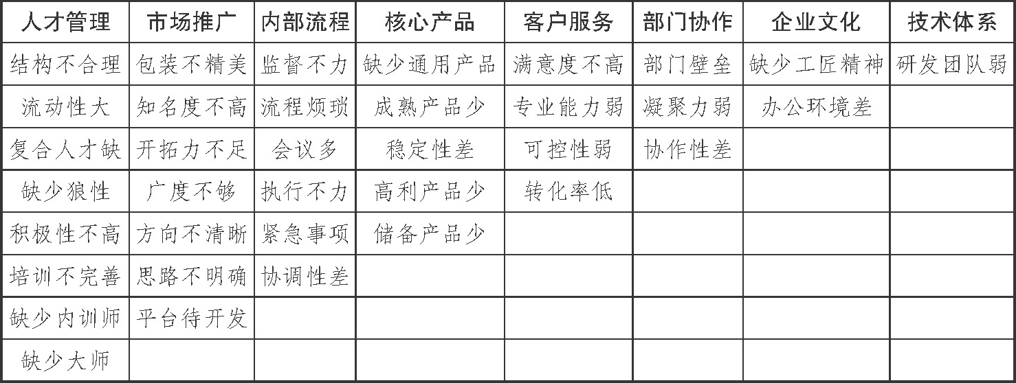 战略共识研讨会第五步是寻找差距,审视企业现状与战略目标之间的差距,为制定战略举措提供方向。为了快速准确地找到差距,建议运用“头脑风暴法”来帮助推进此过程。为了避免个别人控制会议,让所有小组成员在规定的时间内独立思考并记录下自己的观点,然后轮流依次发言,直到穷尽所有的观点。由于其无限穷尽的特点,团队会产生大量的信息和观点。明确关键差距,识别其根本原因,并提出未来提升建议和方案,为关键任务提供切入点。
