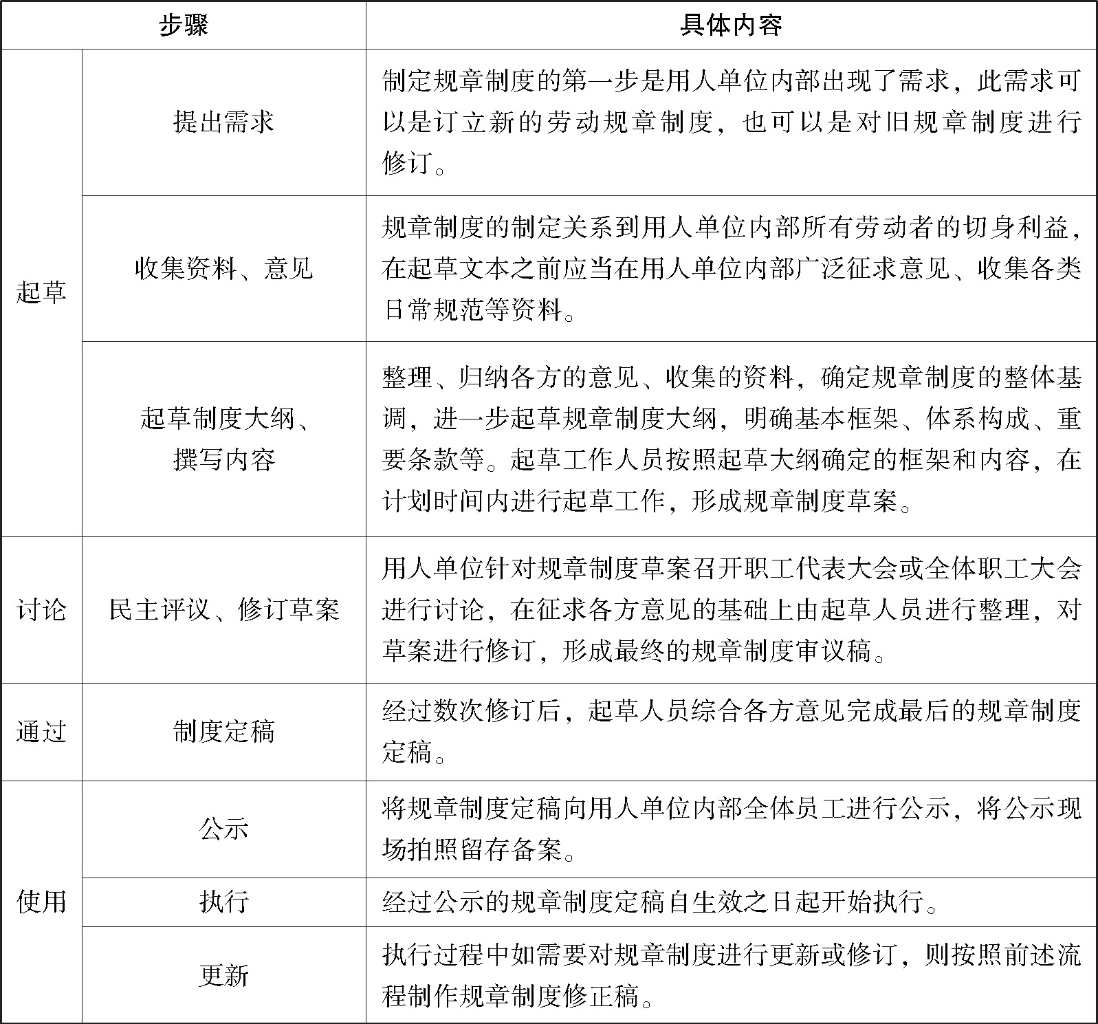 根据《劳动合同法》第四条的规定,规章制度的制定程序一般包括起草、讨论、通过、使用四个步骤: