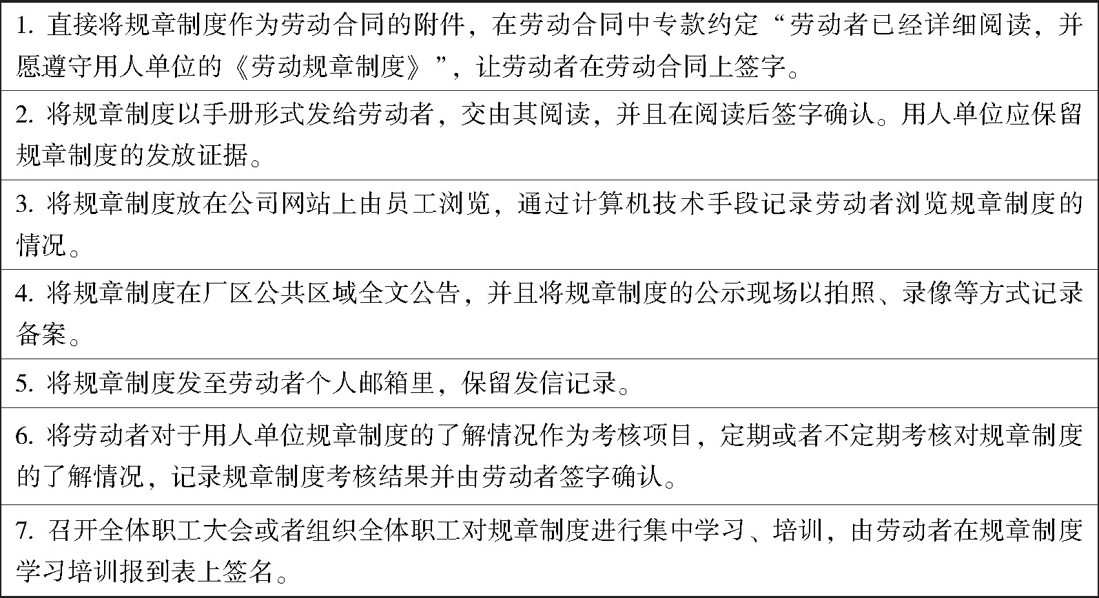 司法实践中对规章制度公示方式的审查比较严格。若没有劳动者签字确认的已经收到或知悉规章制度内容等能够直接证明用人单位已经履行规章制度的公示程序的证据,劳动仲裁机构、法院很难认可用人单位已经向劳动者履行了公示义务。考虑到发生劳动争议需要用人单位举证的问题,建议用人单位使用第1种、第2种、第4种、第6种、第7种方式对规章制度进行公示,其他方式虽然相对简单但采集证据的难度更大(电子证据一般需要公证),一旦不能举证,用人单位可能会承担败诉的法律风险,故不推荐。