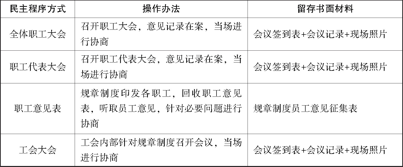 实践中,民主程序可以以工会同意、职工大会或职工代表大会通过、职工意见表投票等方式现场进行,具体流程参见本书其他章节。