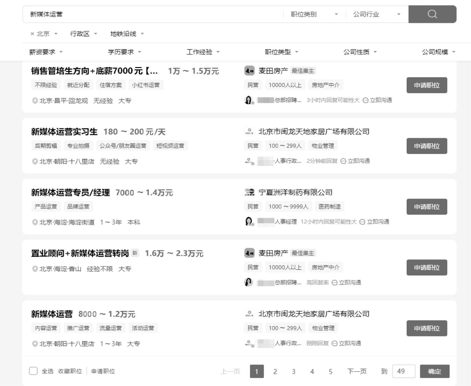 在某招聘网站上搜索“新媒体运营”,可以看到大量职位信息,如图1-1所示。
