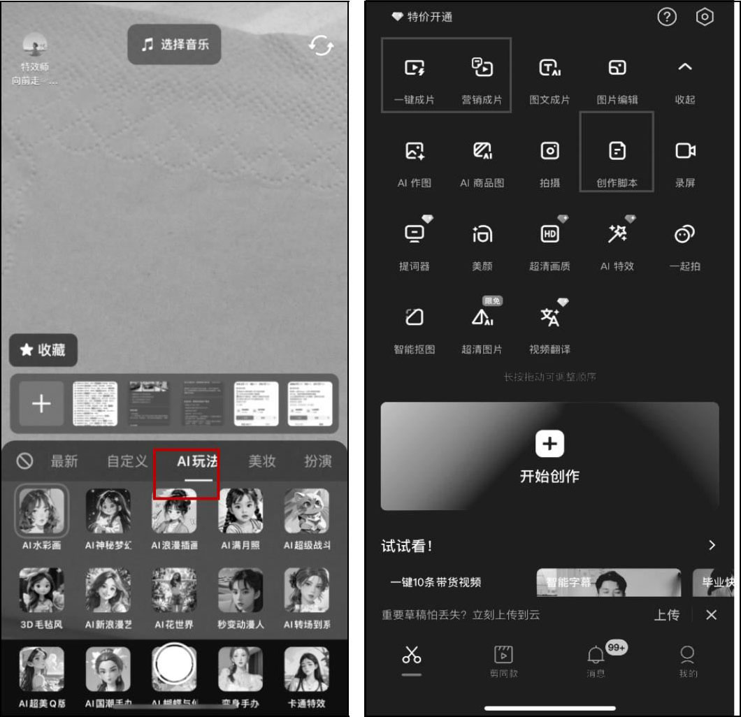 AI功能的强大使很多新媒体平台都开始引入AI功能,以吸引用户。例如,抖音有很多AI相关模板供用户使用;此外,抖音旗下的剪映也具备AI功能,能生成短视频脚本,甚至直接生成短视频,如图1-2所示。