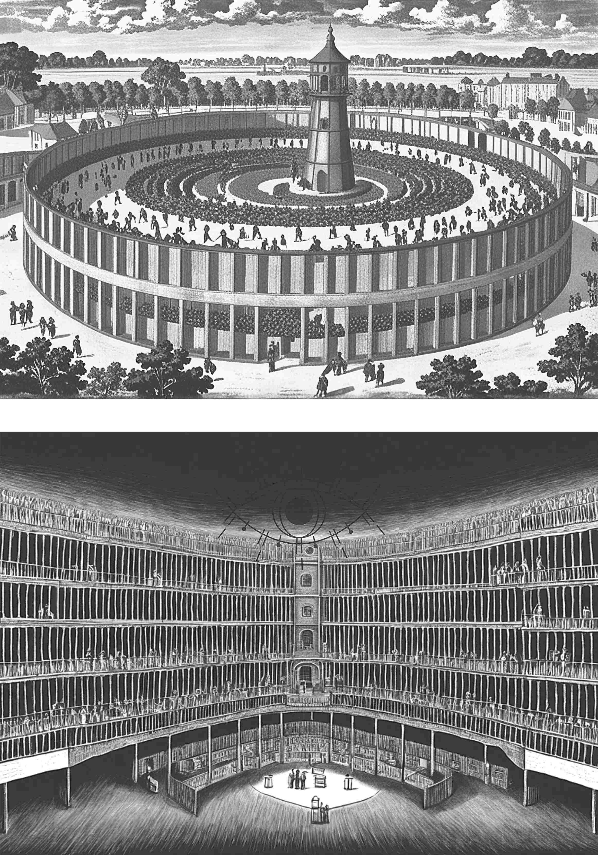 边沁在《全景敞视监狱》的前言中一开始就列举了这种“监视所”可能产生的益处:“道德得到改善,健康受到保护,工业有了活力,教育得到传播,公共负担减轻,经济有了坚实基础,济贫法的死结不是被剪断而是被解开,所有这一切都是靠建筑学的一个简单想法实现的!”