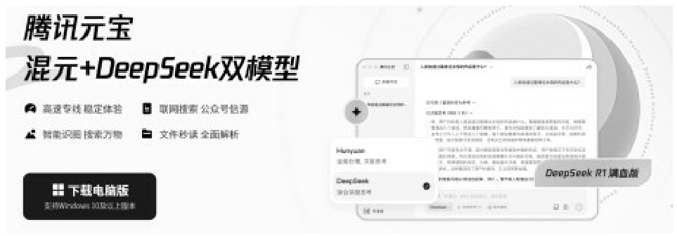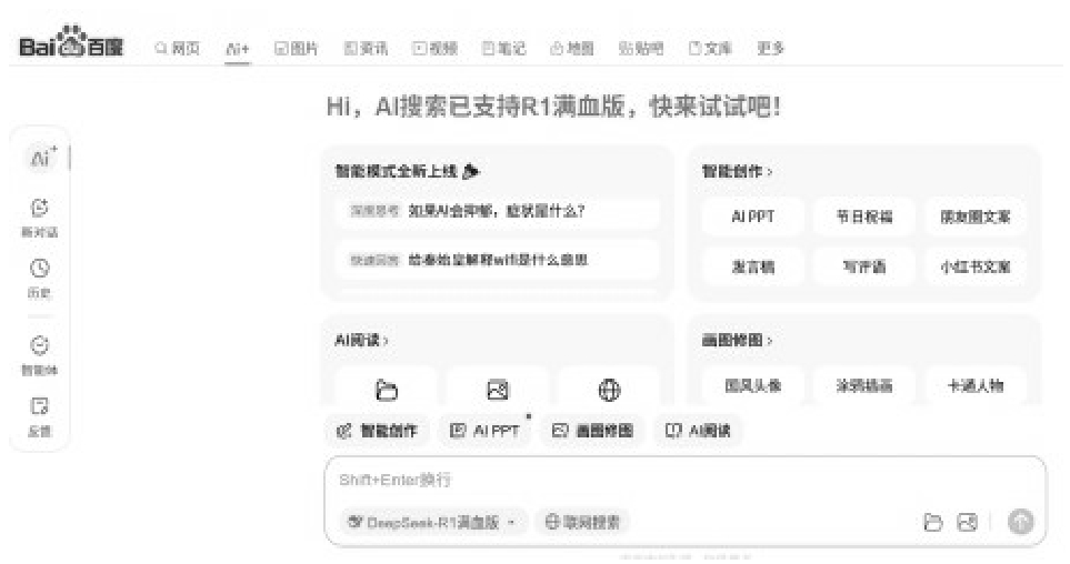 目前,众多应用已与DeepSeek建立了深度合作关系,用户可以通过第三方平台便捷地访问和使用DeepSeek的大模型服务。例如,腾讯元宝(如图1-5所示)、纳米AI搜索(如图1-6所示)、百度AI搜索(如图1-7所示)等应用都融入了DeepSeek-R1模型,为用户提供更加智能、高效的使用体验。