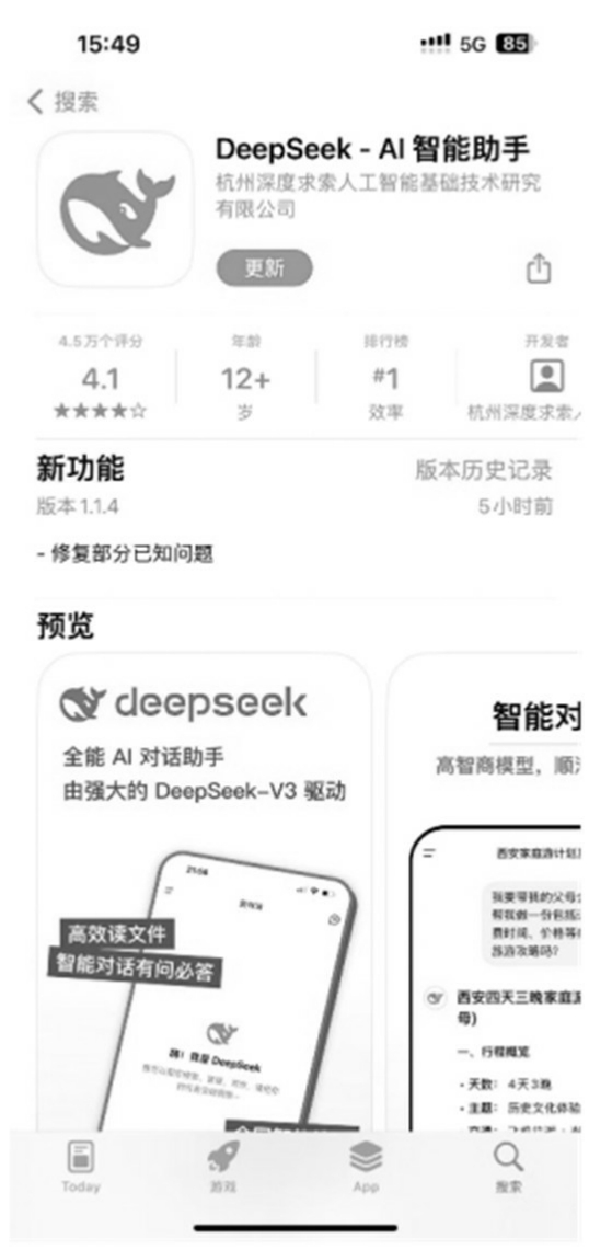 (1)下载客户端。安卓用户或iOS(苹果)用户可以在手机应用市场(商店)搜索并下载DeepSeek应用,界面如图1-4所示。