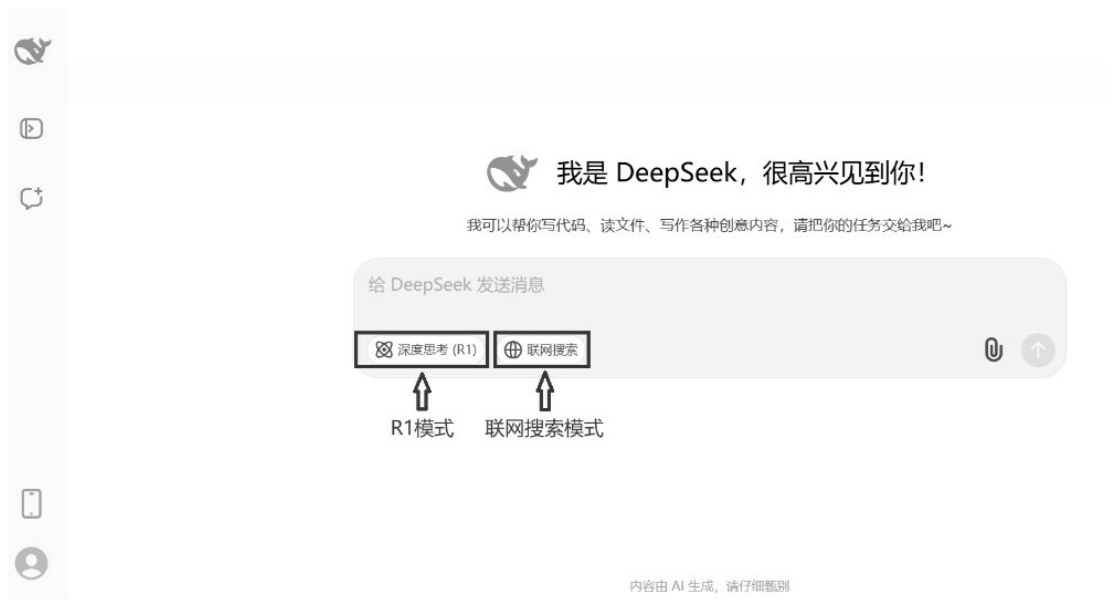 针对不同场景,DeepSeek共有三种工作模式:V3模式、R1模式和联网搜索模式,如图1-8所示。