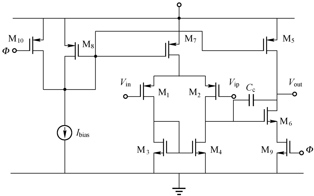 典型的采样开关运算放大器如图1.24所示。采样开关运算放大器的基本结构为一个Class-A的两级密勒补偿结构,且为了满足开关的需要加入了两个由时钟信号控制的M 9 (NMOS)和M 10 (PMOS)。