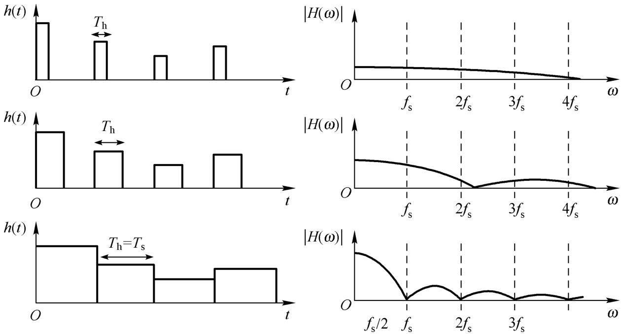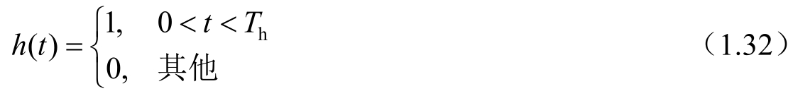 在整个保持周期( T h )内,零阶采样保持电路对采样时刻的采样值进行保持,但改变了采样信号的形状。这种改变是通过一个传递函数来实现的。我们可以认为这个传递函数的脉冲响应就是在整个保持周期内,将狄拉克脉冲序列乘以常数“1”得到的,即
