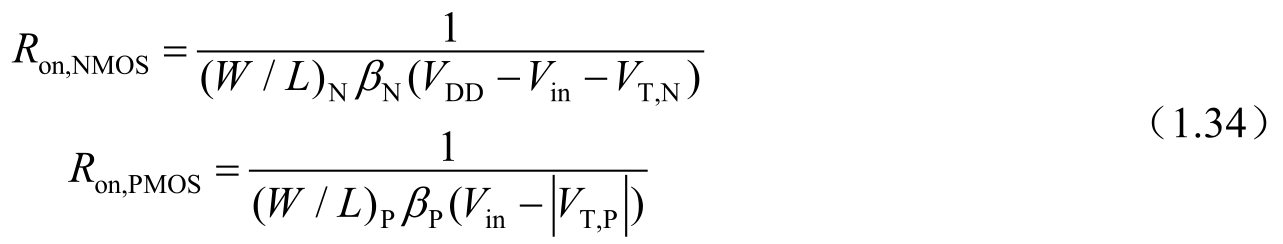 在0.13 μ m CMOS开关中,对于NMOS,典型的NMOS阈值电压约为0.3V;当 V GS - V T ≥0.2V时,NMOS才能良好地导通,此时最小的 V GS 为0.5V;根据 V GS = V DD - V in ≥0.5V,可以得到 V in ≤ V DD -0.5V;如果输入信号 V in 继续增大,则NMOS不能导通。