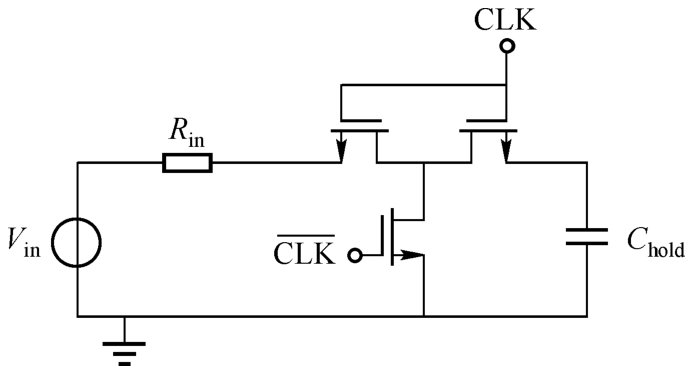 采用CMOS开关的优点在于CMOS开关在导通时具有相对稳定的导通电阻,从而减小输入信号采样时产生的失真。但随着电源电压的下降(如1V以下的电源电压),CMOS开关已经处于截止边缘,无法对输入信号进行采样。