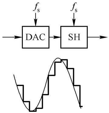 采样保持电路的另一个应用是在数/模转换过程中,将狄拉克脉冲序列恢复成连续时间信号。在数/模转换过程中,采样保持电路的作用如图1.16所示。DAC的输入信号是一系列对应于采样时刻而获得的数字码(这些数字码可以从ADC或其他数字信号处理电路中得到)。
