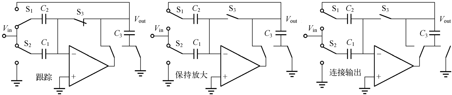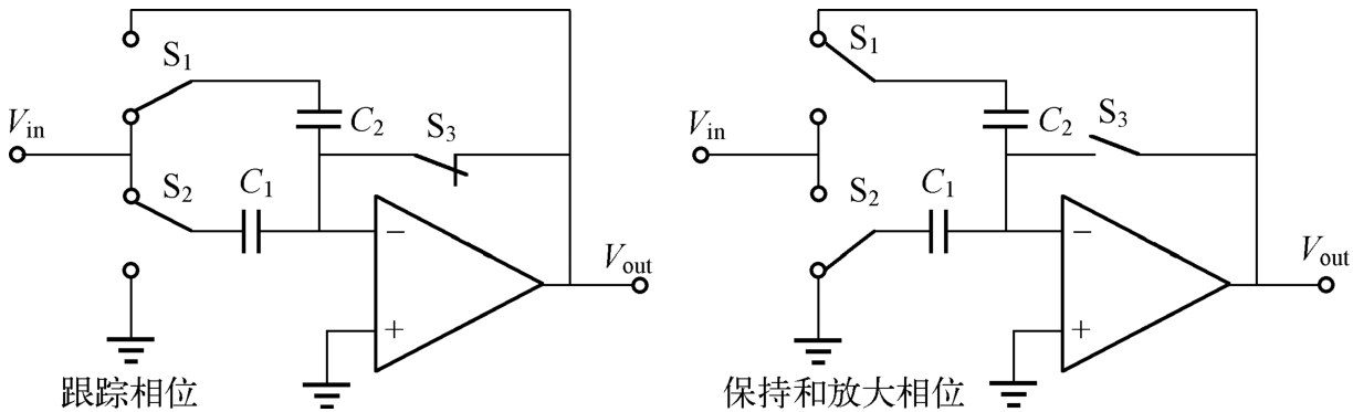 一种更复杂的跟踪保持电路在跟踪、保持信号的同时,还可以对信号进行放大,其电路如图1.33所示。在跟踪相位时,开关S 3 闭合,将运算放大器连接为单位增益反馈电路,电容 C 1 和 C 2 并联连接输入信号;在保持相位时,开关S 1 通过电容 C 2 产生反馈通路,而开关S 2 将电容 C 1 连接地。这时, C 1 上对应输入信号的电荷就转移到 C 2 上,电路的输入电压和输出电压关系可以表示为