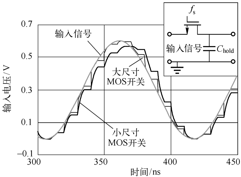 在实际情况中,当进行采样时,微小的输入信号会被放大,从而会损坏流水线型或基于算法实现的ADC。在一些先进的工艺中,MOS开关的沟道电荷较少,因此上述电荷的变化不会产生过多的负面效应。
