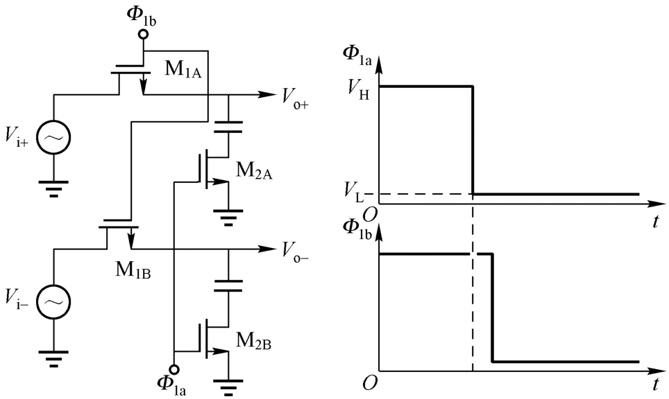 我们之前讨论了与输入信号有关的沟道电荷会影响采样过程。为了消除这个影响,通常采用底极板采样的方式来解决。底极板采样的结构及时序如图1.26所示。其中,采样电容的底极板通过MOS开关连接地,M 2A 、M 2B 略微在M 1A 、M 1B 前导通,使得M 1A 、M 1B 的时钟信号馈通和电荷注入不会对输出信号产生影响,而M 2A 、M 2B 的时钟信号馈通和电荷注入会对输出信号产生影响,从而使引入的输出信号误差通过差分结构消除。即便M 2A 、M 2B 的时钟信号馈通和电荷注入对输出信号的影响存在差异,但M 2A 、M 2B 的尺寸一般较小,所以引入的输出信号误差往往也可以被控制在精度要求范围之内。