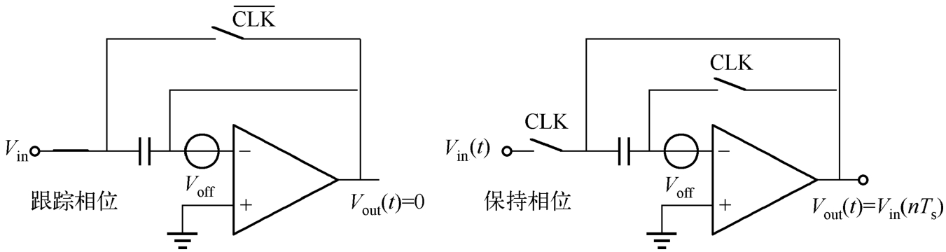 为了使缓冲器获得较大的输入范围,同时克服其他不利因素,我们可以采用失调抵消技术的跟踪保持电路,如图1.30所示。在跟踪相位(时钟信号开关闭合)时,缓冲器是一个单位增益反馈结构。缓冲器的失调电压及低频噪声都出现在运算放大器的负输入端,并存储在电容中。在保持相位时,只有反相时钟信号开关闭合。运算放大器通过电容形成反馈。根据电荷守恒,这时的输出信号将会“复制”输入信号,从而保证在电容两端具有和输入信号连接时相同的电压。在这种情况下,输出电压就不会受到输入失调电压及低频噪声的影响。但是,由运算放大器产生的高频噪声则会被采样到信号中。失调电压到输出信号的传递函数为