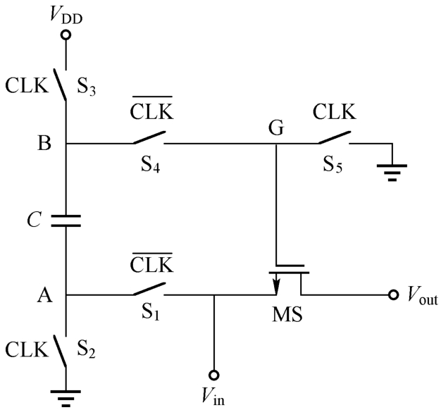 (2)采用电压乘法器提供超过电源电压的输出电压。该输出电压只作为CMOS开关的栅极驱动电压,CMOS开关中几乎没有电流,因此这种方法使CMOS开关附加功耗较小。电压乘法器通常由多级二极管和电容组成。电压乘法器的级数越多,输出电压越大,且电容越大,输出功率也越大。