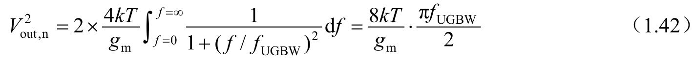 反馈通路将输出噪声电压返回输入端。结合输入差分对噪声频谱及单位增益传递函数,可以得到跨导噪声修正系数 α 为1。式(1.42)中的系数2来源于两次不连续采样。这两次不连续采样分别是在跟踪相位时和保持相位重新连接时。系数( f UGBW π)/2≈1.57 f UGBW 表示理想一阶传递函数能量的滚降特性。一级运算放大器的单位增益带宽由输入差分对的跨导和负载电容决定,即 f UGBW = g m /(2π C load )。二级运算放大器的单位增益带宽则由输入差分对的跨导和密勒补偿电容决定。于是,可得