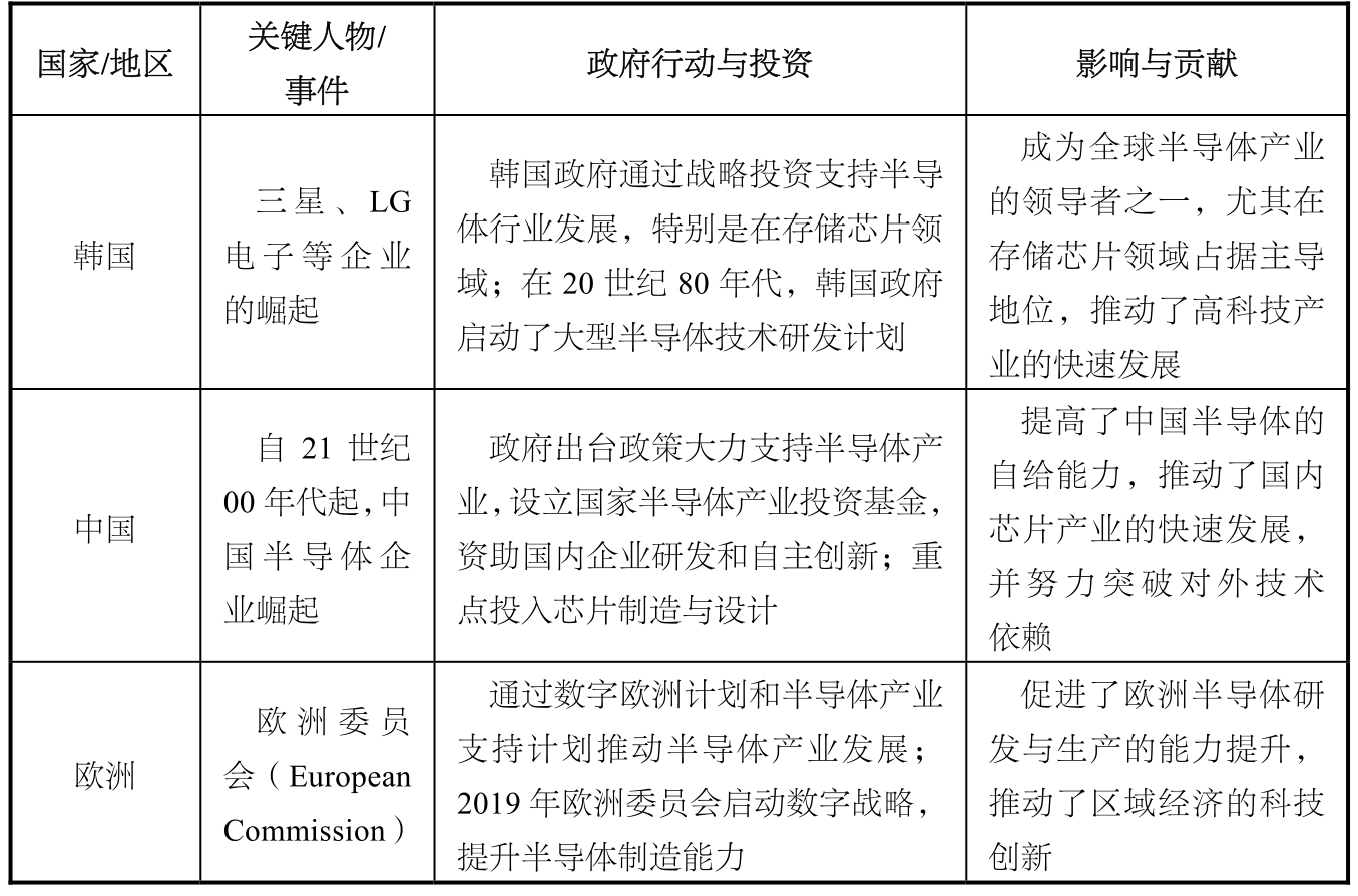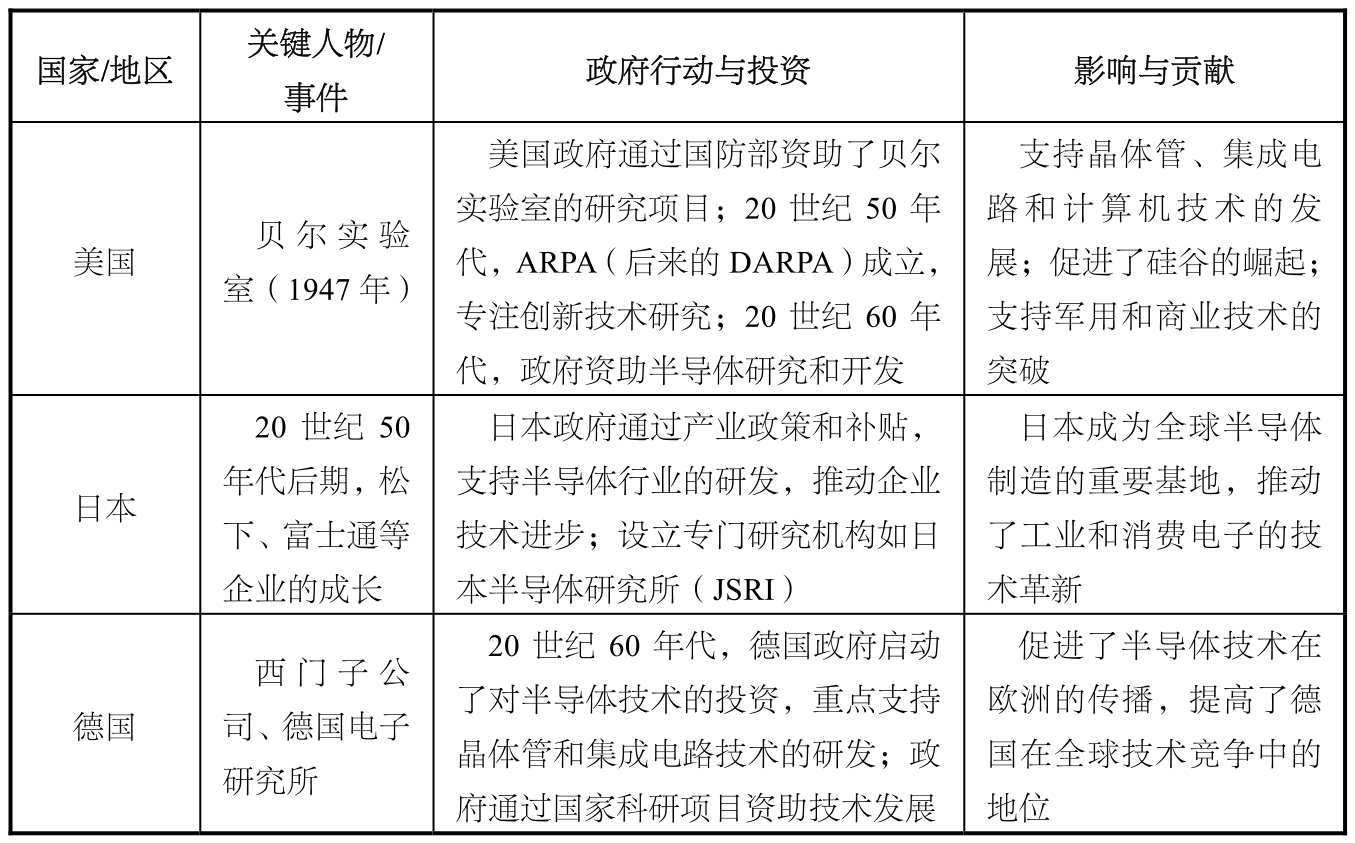 中国的半导体产业起步较晚,但自改革开放以来,政府逐渐认识到半导体技术对于国家经济和科技进步的重要性。1978年,中国政府开始加强对半导体技术的研发投入,并设立了多个半导体研究中心,推动国内企业开展自主研发。中国政府通过资助国内企业、鼓励科技创新、加大对外技术合作等方式,逐步提升了本国半导体产业的技术水平。进入21世纪后,随着国家政策的大力支持,中国的半导体产业得到了快速发展,特别是在集成电路和芯片制造领域取得了显著进展。各国政府对半导体技术研发投资的情况如表2-3所示。
