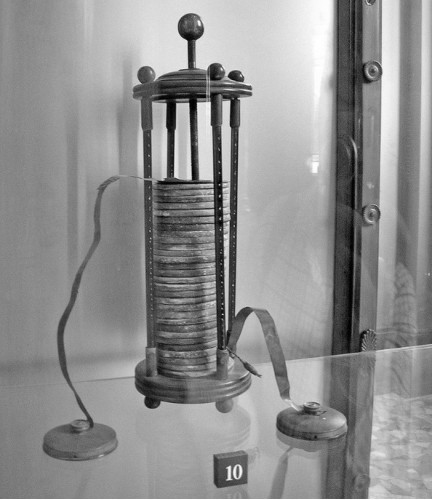 电池的发明是这一时期的重要里程碑。1800年,意大利科学家亚历山德罗·伏打(Alessandro Volta)发明了世界上第一块电池——伏打电堆,如图1-7所示,这一装置通过将不同金属片交替堆叠在一起,利用化学反应产生持续的电流,为电力的实际应用开辟了新的道路。伏打电池不仅是第一个可持续供电的装置,还为电流的传输和电路的概念提供了理论依据。