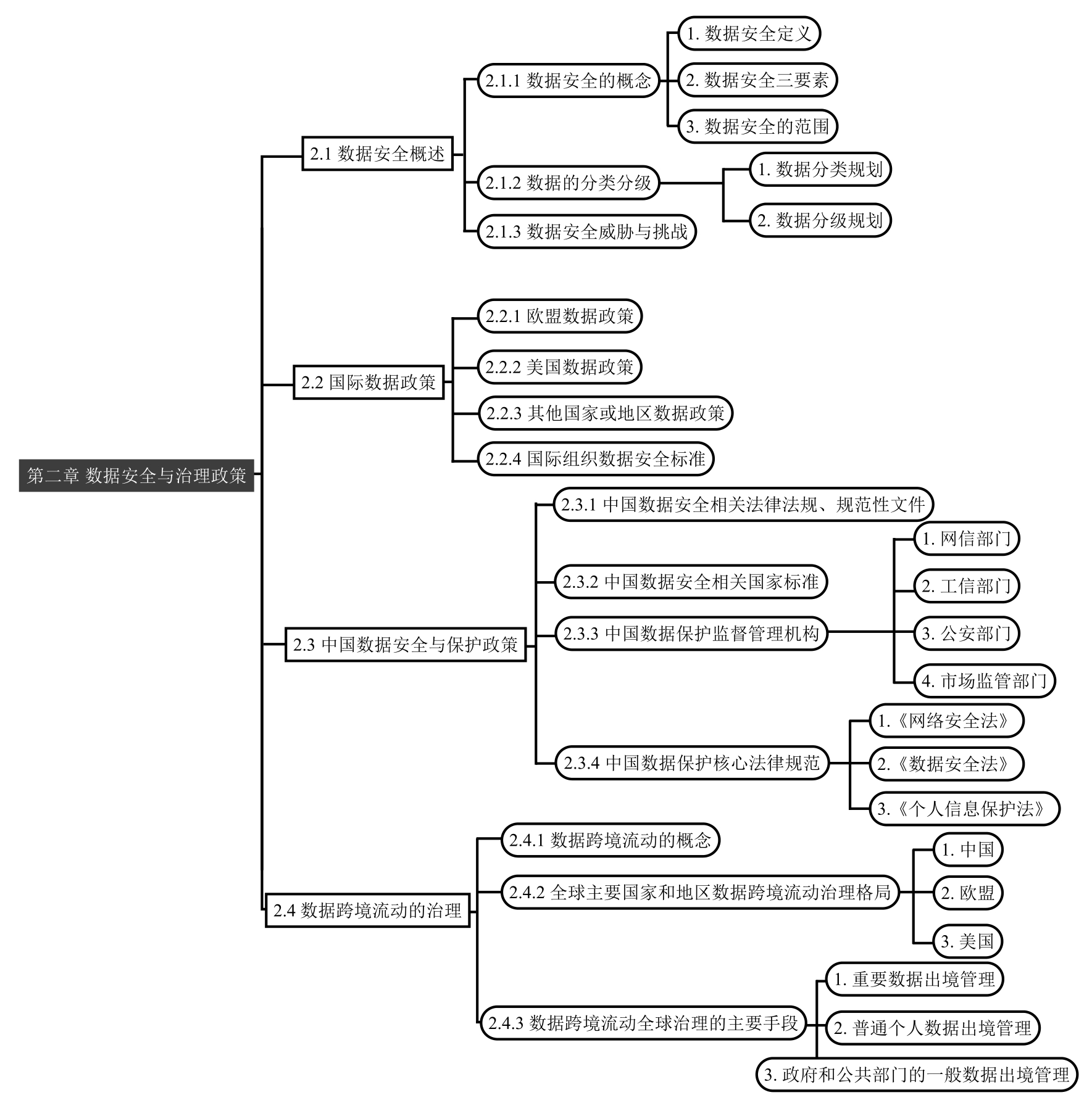 本章将探讨数据安全的含义、数据分类分级的基本规则,并剖析当前数据安全所面临的各项挑战。同时,本章还涵盖了国内外在数据安全治理方面的立法实践。不同国家基于其独特的社会文化背景、经济发展需求及战略考虑,形成了各具特色的数据治理政策。此外,本章将介绍数据跨境流动治理的现状,探讨各国如何在推动数据自由流动与加强国家数据安全控制之间进行权衡。本章深入剖析这些问题,提供了一个较为全面的数据安全现状分析。本章主要学习目标如下。