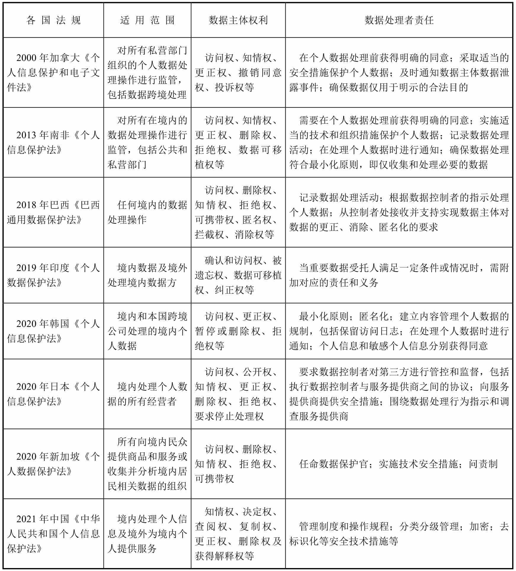 随着数字经济社会的兴起,个人数据隐私问题也越来越多,于是,越来越多的数据保护条例在世界各国涌现。截至2024年,共有138个国家发布了数据隐私立法,如巴西《巴西通用数据保护法》、韩国《个人信息保护法》、日本《个人信息保护法》、加拿大《个人信息保护和电子文件法》、南非《个人信息保护法》、印度《个人数据保护法》、新加坡《个人数据保护法》和中国《中华人民共和国个人信息保护法》等。各国数据保护政策对比如表2-4所示。