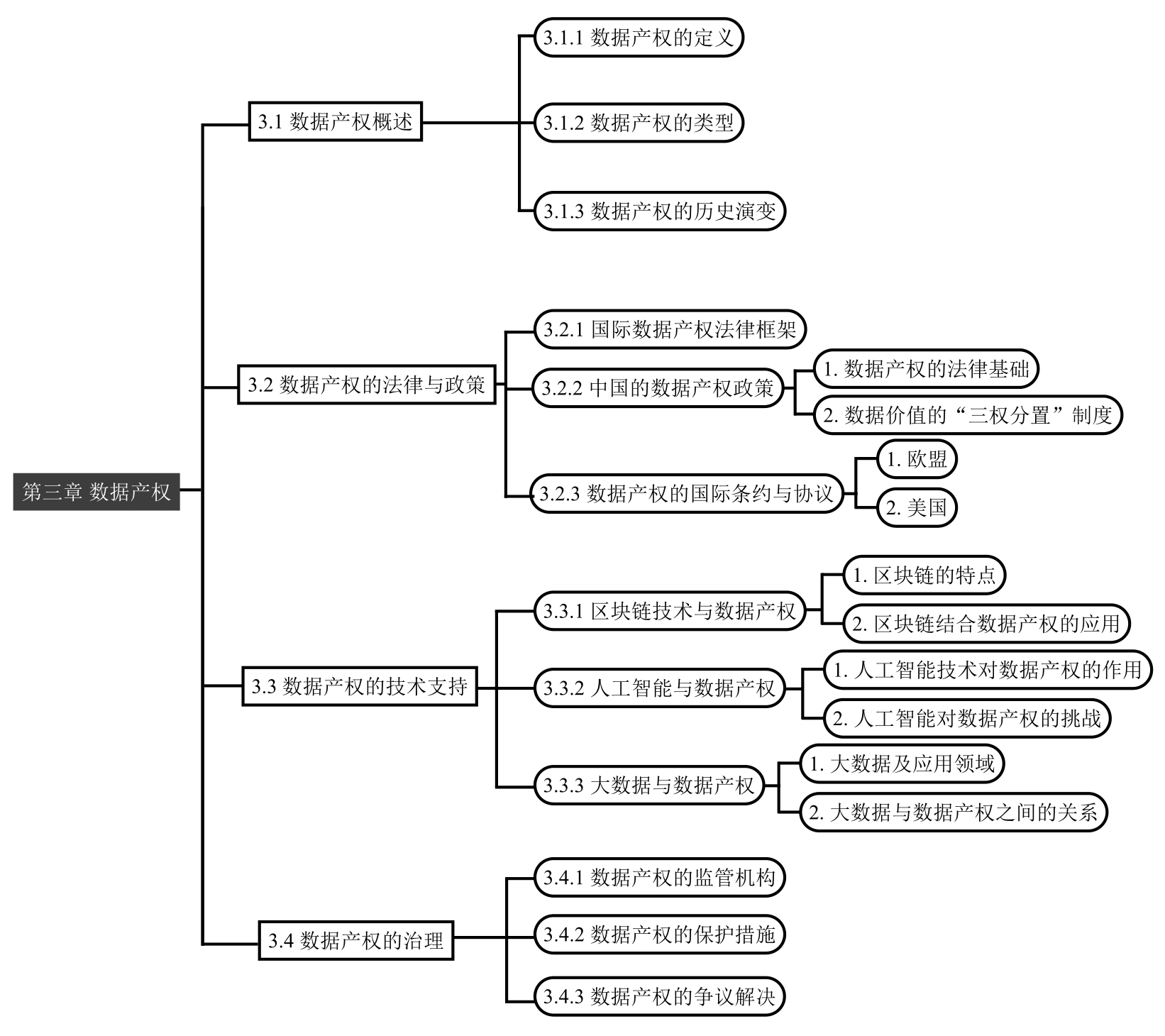 首先,本章为读者提供数据产权的概述,探讨其定义、类型与历史演变。其次,本章将讨论国内外关于数据产权的法律与政策,以及中国目前相关的数据产权制度体系。再次,本章还将探讨数据产权的相关技术支持,便于读者进一步了解数据产权。最后,本章还将讨论数据产权的监管与保护措施。本章的学习目标旨在帮助读者全面理解数据产权的各个发展方向,通过对本章的学习,读者将获得一个全面、深入的数据产权视角。
