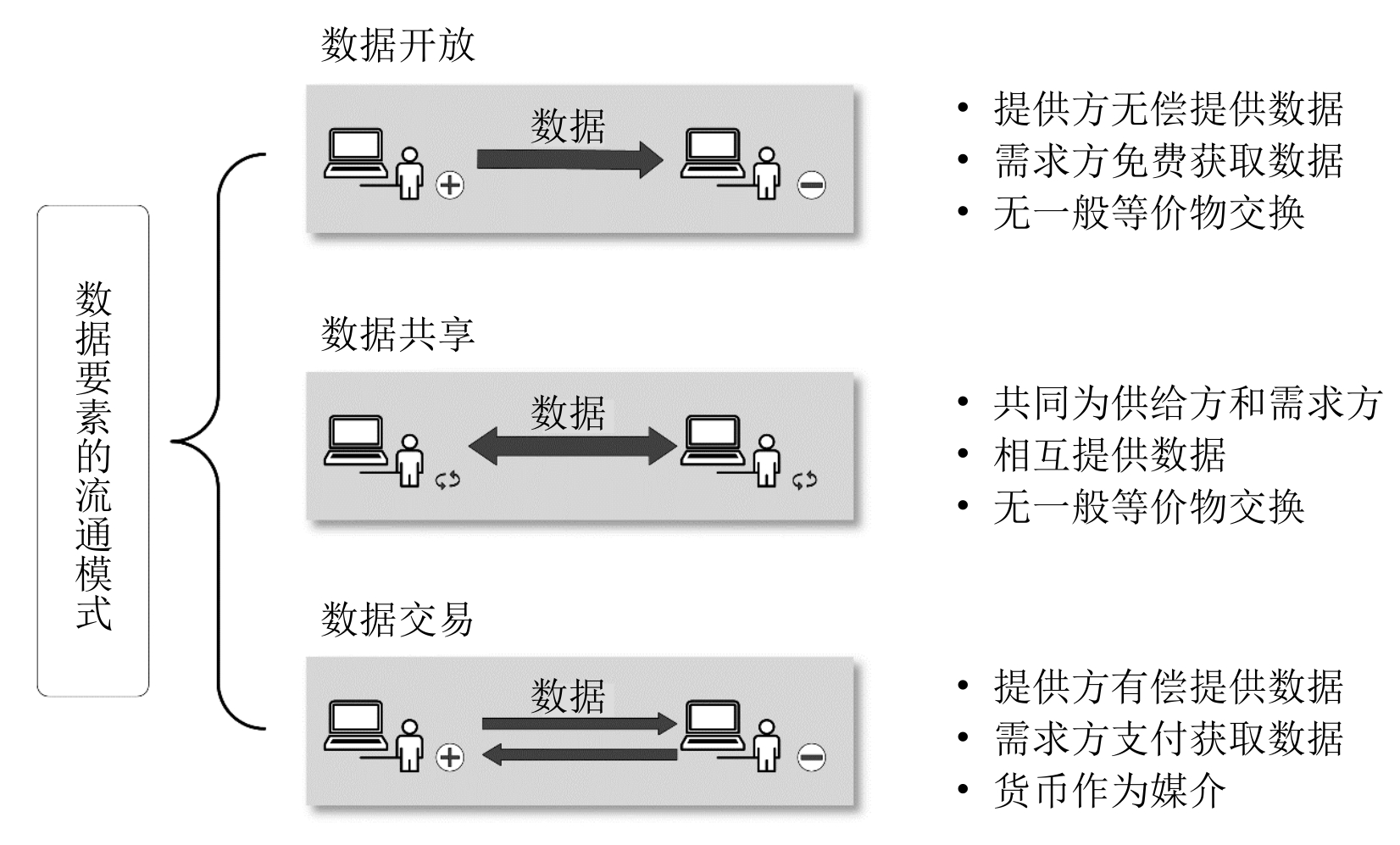 时至今日,数据作为数字经济时代核心的生产要素,在社会生产、生活中的巨大价值已经不言而喻。数据要素价值的充分发挥在于它的有效流通和共享,也已经成为人们的共识性认识。数据价值的发挥依赖多元数据的融合、分析与应用,只有数据流通起来、使用起来,才能产生价值、发挥作用。当前按照数据与资金在主体间流向的不同,可分为数据开放、数据共享、数据交易三种流通模式。数据要素流通的三种模式如图1-2所示。