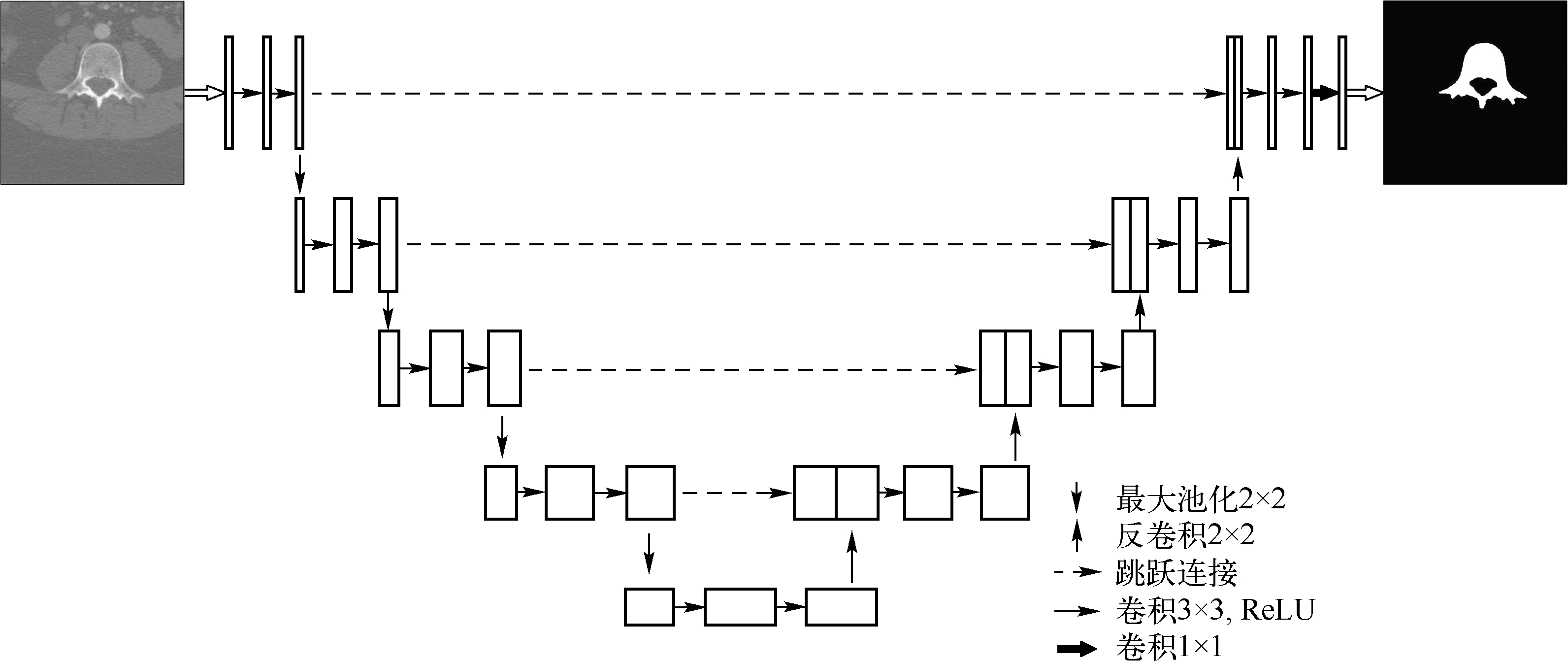 目前,深度学习方法,尤其是CNN,在医学图像处理中得到了广泛应用。CNN在不同尺度的感受野下,能学习到的特征不同,大的感受野能够更多学习到全局特征,而小的感受野能够更多学习到局部的细节特征。因此,CNN相比一般的全连接前向网络更适合应用于图像处理领域。目前,大多数主流的图像数据分类模型都是基于CNN的一系列改进。图像分割或目标检测也可当作是分类任务,即把每一像素分为目标或非目标两类。UNet [13] 是一种2015年提出的FCN架构,专用于图像分割任务。本章分割脊柱X线图像就是基于U-Net模型,本节对U-Net模型进行简要介绍。