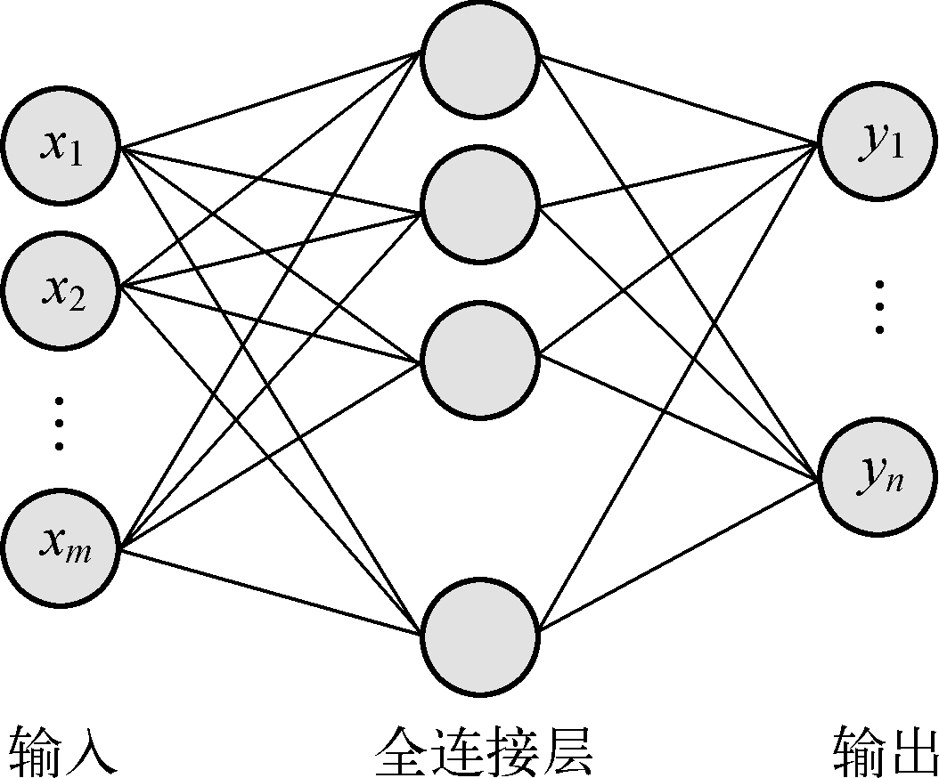 在CNN架构中,全连接层一般位于卷积层和池化层之后,将卷积层和池化层输出的特征图矩阵展平(Flatten)为一维向量作为全连接层的输入。全连接层在CNN中也扮演着重要角色,主要用于综合和解释已学习的特征。如果说卷积层、池化层是学习原始数据与高级特征之间映射关系的,那么全连接层则是学习这些高级特征到目标结果之间映射关系的。简单的全连接层结构如图2.4所示,两层之间所有神经元都有权重连接,这些权重也是通过训练神经网络获得的参数。最后一层全连接层的激活函数一般采用Softmax激活函数,输出不同类别的概率分布,以进行分类。
