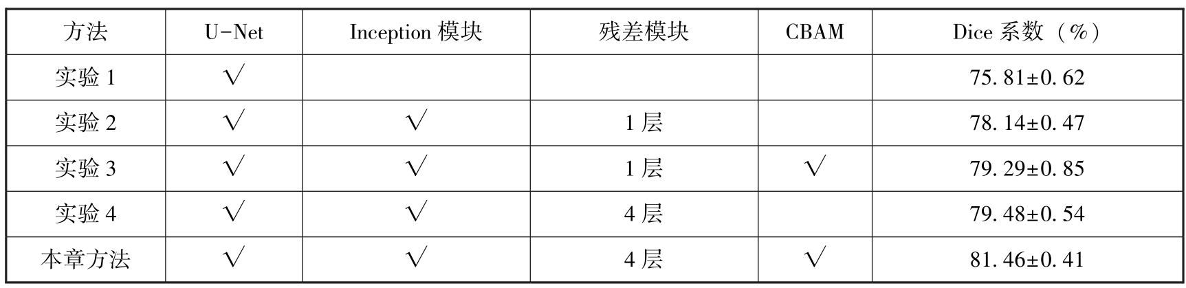 我们设置考虑不同的网络结构来确认各模块的有效性。实验1模型是原始的U-Net。实验2则是使用Inception模块替换了U-Net的下采样卷积核,并使用了一层残差模块。实验3在实验2的基础上在网络的瓶颈层加入了CBAM。实验4在实验2的基础上使用了4层残差模块。而本章提出的方法则是在实验4的基础上,在网络的瓶颈层加入了CBAM。通过这样的消融实验来证明本章提出的方法具有最佳的性能。