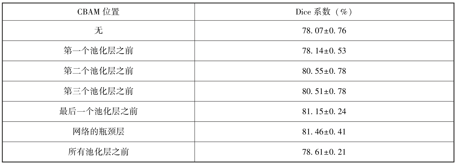 对分割网络,通过实验比较了不同的网络构造策略的有效性。首先在网络的不同位置添加CBAM,来评估CBAM的有效性;然后评估网络中不同模块的性能,将Inception模块、残差模块和CBAM分别加入到网络中,评估这些模块的有效性。