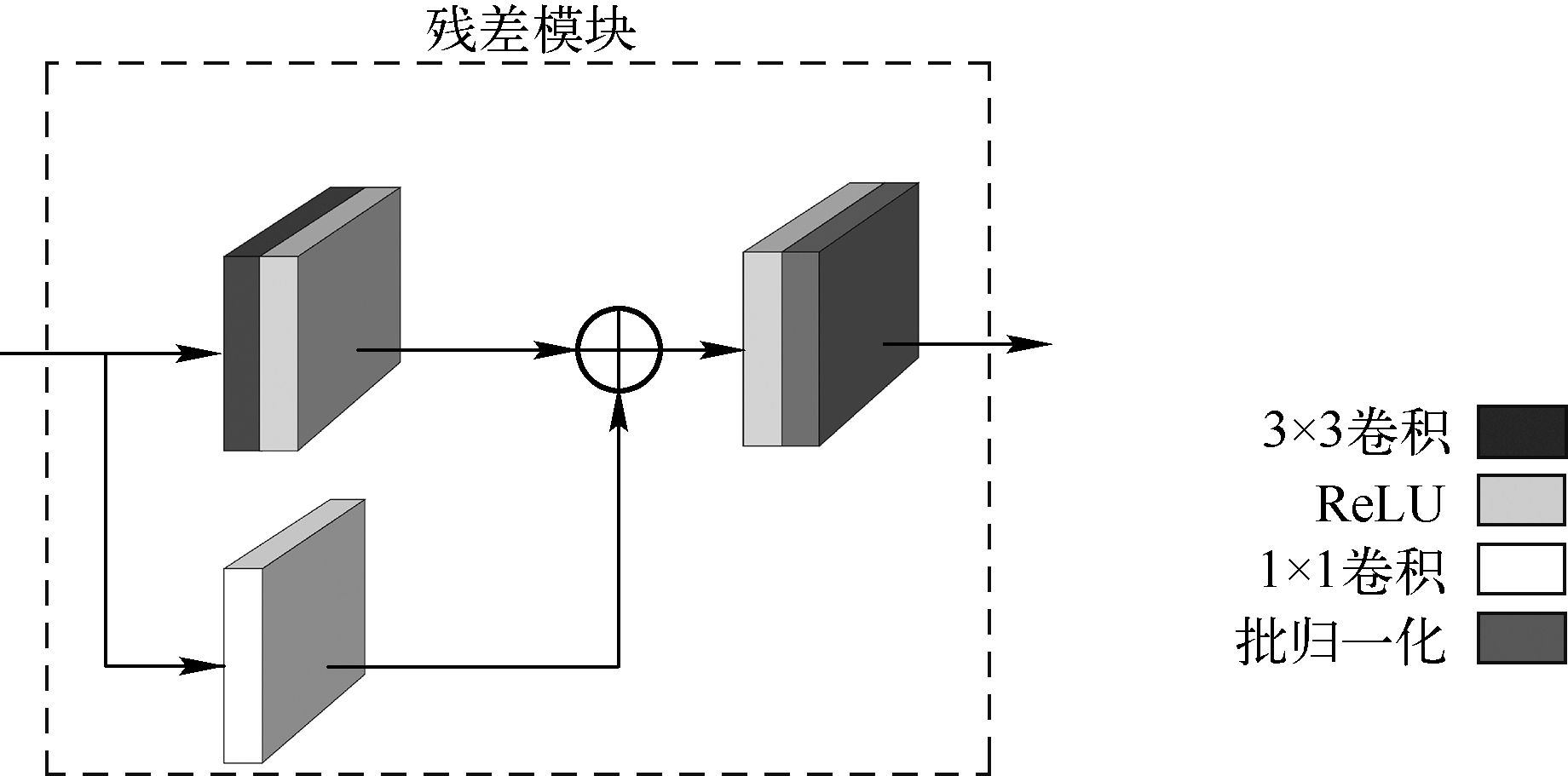 当图像通过Inception模块时,将3个不同尺度卷积核的特征映射连接起来。为了使输入特征与上采样层的输出特征融合,增加残差模块来调整特征图的大小,以解决梯度爆炸或梯度消失的问题。残差模块结构图如图2.8所示,它由3×3卷积核和1×1卷积核组成。同时采用ReLU激活函数和批归一化处理,可提高收敛速度。
